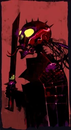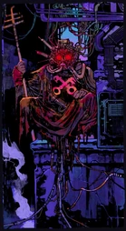 Фон этой карты плоский, светло-красный. Вся внимание карты сосредоточено на ее центральном персонаже - кибернетической или роботизированной фигуре, обращенной влево, с металлической головой с шипами на верху и светящимися желтыми глазами. Из задней части черепа выходят многочисленные провода и кабели, уходящие из поля зрения. Фигура с раздвоенным органическим языком, кажется, облизывает короткий, угловатый меч, держащийся вертикально в правой руке, и украшенная в стиле самурайской латной брони, создающей жесткие угловатые силуэты.