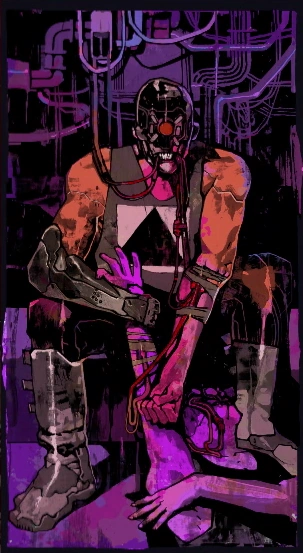На переднем плане изображения возвышается мужская фигура, озаренная ярким белым светом. Окружающий мир окрашен в насыщенные оранжевые оттенки. За сидящей фигурой растягивается задний фон в красных и розовых тонах, на котором извиваются трубы и конструкции, создавая иллюзию сцены в недрах какого-то промышленного завода. Торс фигуры обнажен, демонстрируя силу и уверенность. Ее поза полна вызова и уверенности. Вместо обычного лица фигура имеет большой ярко-желтый глазной имплант, напоминающий всевидящее око циклопа. Тело украшено различными имплантами. Правая рука фигуры уверенно упирается в правую ногу. В левой руке она держит длинный жезл, увенчанный массивным набалдашником, символ власти и авторитета. Под ногами фигуры разбросано множество проводов, переплетающихся и обвивающих ее ноги, словно корни, укрепляющие ее в этом мире. Часть этих проводов устремляется к самому жезлу, создавая впечатление, что власть и сила этой фигуры исходят прямо из земли.