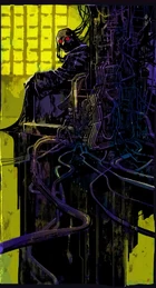 Фон, окрашенный в желтый цвет, почти полностью закрыт, за исключением верхнего левого угла, который кажется имитирующим либо окна склада, либо компьютерные мониторы, уложенные в матрицу. Большую часть пространства занимает машинария и провода, образующие троноподобное кресло темных оттенков черного, фиолетового и синего цветов. К креслу присоединена человекообразная фигура: многочисленные провода подключены к голове, голова повернута к зрителю, с двумя ярко-красными глазами, без других четко видимых черт лица. Фигура одета в свободную, похожую на мантию одежду.
