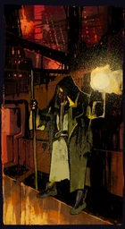 Сюжет изображения разворачивается среди металлических балок и опор, с градиентом от глубокого красного цвета на заднем плане, который становится ярче и переходит в теплый желтый. Башни и опорные составляют верхний фон, в то время как центральный фон - это низкая стена, а нижняя часть карты изображает бетонный выступ с льющимся снизу теплым светом. На выступе стоит фигура в плаще с посохом в правой руке и факелом в левой, лицом к зрителю, но немного повернута влево. Ее одежда темная, и, кажется, что фигура носит газовую маску с трубкой, которая опускается вниз за торс. Один глаз газовой маски частично виден под капюшоном фигуры и имеет мягкий желтый оттенок.