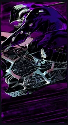 Фон изображения абстрактный, темно-фиолетовый, с легкими фиолетовыми линиями, создающими ощущение движения и скорости. Главная фигура карты занимает примерно две трети ее верхней части. Это фигура, согнувшаяся в позе, одетая в толстую одежду, кажущуюся кожаной, также окрашенную в фиолетово-синий цвет, с черным изогнутым шлемом, который сгибается вниз, закрывая почти все лицо. Виден открытый рот фигуры, кожа которой чисто белая и призрачная. Фигура едет на мотоцикле, серебряного переливающегося цвета. Видна только центральная часть мотоцикла, движение происходит справа налево, под наклоном.