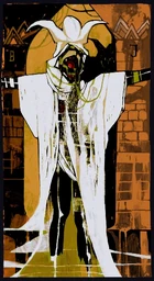 Человек в золотом пиджаке с лицом черепа стоит за столом, за которым находится стена красных масок. Как и в классическом изображении карты Таро, Маг имеет символ бесконечности, здесь он расположен под грудью. Также на столе лежат предметы, представляющие масти: несколько ножей (Мечи) и банка напитка (Чаши) с пятиконечной звездой (Пентакли). Однако в этом изображении заметно отсутствует любой очевидный объект, представляющий масть Жезлов.