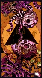 Фон изображения абстрактный и состоит из слоев; самый задний слой - это просто оттенок слегка темного оранжевого, перед ним находится желтый круг, а перед ним - черный треугольник. Внизу фона изображено что-то вроде растения, кажется, с маленькими зелеными и красными пламенами на нескольких точках его извилистых, зазубренных ветвей. Основной элемент карты - верхние половины двух скелетов, один из которых выходит снизу карты и смотрит вверх, а другой - сверху карты и смотрит вниз. Эти скелеты смотрят друг на друга, с неестественно длинными и заостренными языками, высунутыми из ртов, изгибающимися так, что они соприкасаются друг с другом. У верхнего скелета из реберной клетки, которая почти не видна, ползет змея с пурпурными и белыми полосами вокруг шеи и к левой стороне черепа верхнего скелета, чуть за нижней челюстью. Нижний скелет, кажется, более поврежден и имеет кибернетические провода и узлы на левой половине своего черепа, левая сторона которого наиболее видна зрителю.
