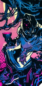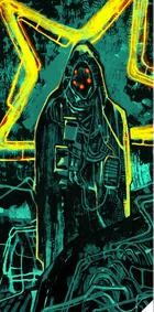 На полотне карты предстает фигура, одетая в темно-берюзовые одеяния, напоминающие напоминающие одежду кочевников. Ее балахон мягко окутывает формы, создавая образ таинственного путника. На груди в беспорядке висят разнообразные устройства, словно амулеты. На заднем плане - стена, на которой желтым неоновым светом изображена пятиконечная звезда. Над этим фоном звезды легкий свет ложится на силуэт фигуры, играя отблесками на ее одеяниях. Под капюшоном балахона скрыто лицо персонажа, но в глубине тьмы мерцают пять оранжево-красных глазных имплантов или окуляров маски, эхом символично откликающиеся на пять концов звезды. На переднем плане рассеянно разбросаны провода и трубки, привлекающие внимание этой фигуры.