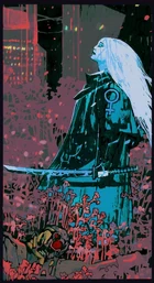 На заднем плане изображена смесь двух высоких небоскребов, окрашенных в багровый цвет на фоне кромешной черноты неба в верхней части карты, и с середины вниз - цветочные, природные мотивы с цветами, стеблями растений и другими подобными сценами, окрашенными в градиент от приглушенных пурпурных в середине до красно-розовых внизу. В центре изображения и немного справа стоит одинокая женская фигура, окрашенная в синий цвет, с закрытыми глазами, повернутая лицом влево. Длинные белые волосы развеваются за ней, а лицо наклонено вверх. На левом рукаве ее длинного кимоно изображен символ зеркала Венеры, а в левой руке она держит обнаженную катану.