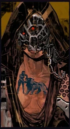 Фон изображения практически отсутствует, так как фигура женщины от груди и выше занимает большую часть изображения, за исключением темно-грязно-желтых углов в верхней части. Фигура одета в капюшон, но вместо лица видна только пустота: металлическая сетка формирует каркас лица, с двумя красными точками вместо глаз, расположенными не по центру, а смещенными влево. Единственная человеческая часть лица, которая осталась, - это подбородок и нижняя губа. Ниже головы виден участок тела, на котором находится татуировка женской фигуры, разрывающей пасть волка. Татуировка окрашена в глубокий синий цвет. Одежда фигуры похожа на плащ с капюшоном с металлическими элементами по обе стороны передней части туловища. Шея углубляется, обнажая большую часть центра груди женской фигуры, хотя ее грудь в основном прикрыта U-образным изгибом ее одежды.