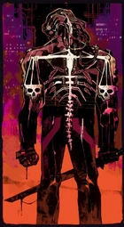 Фон абстрактен, но в какой-то степени симметричен; нижняя часть карты - это дымка оранжевого света. Верхняя часть карты делится пополам: черный цвет занимает центр, и из оранжевого оттенка внизу поднимаются два фиолетовых, высоких здания с различными трубами и конструкциями, исходящими из них. В центре карты стоит фигура, спиной к зрителю, но голова повернута влево, как будто она смотрит назад, на зрителя. Тело фигуры полностью черное с некоторыми светло-фиолетовыми акцентами. На спине фигуры находится костяную форму, слегка имитирующую типичное строение скелета, пока зритель не замечает плечи и руки, где становится ясно, что костяные узоры имитируют каркас весов, например, а чаши весов - черепа. Левая рука фигуры сжата, в правой руке меч, обе руки опущены вдоль тела. Из затылка фигуры выходят многочисленные провода, трубки и кабели, и, кажется, левый глаз фигуры выглядит приглушенно-серым, будто взирая через очки.