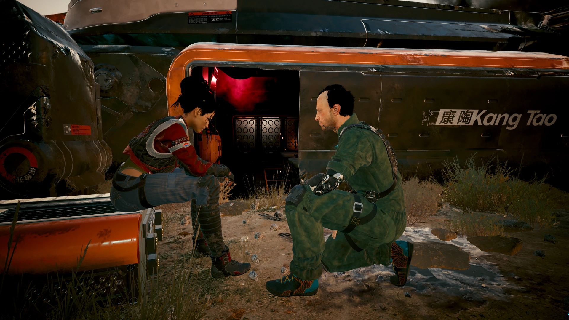 Отключившись от дрона, Ви готовится идти на место крушения. Парам порывается следом. Ви указывает на её ранение и просит остаться в машине, но Панам всё равно берётся прикрывать его/её из винтовки.
