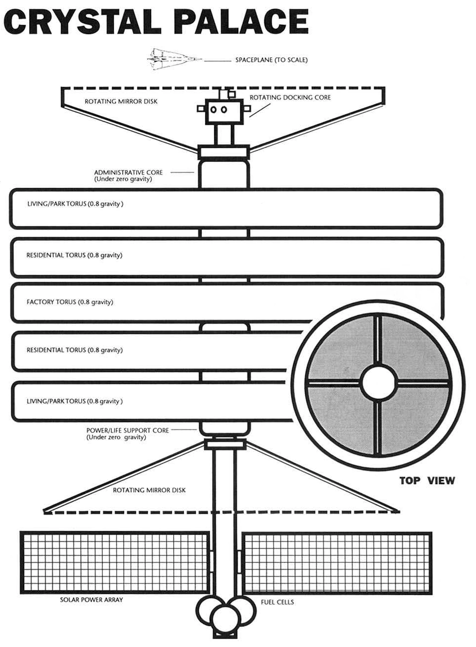 During the 2020s, the Crystal Palace was a five toroidal ring structure built around a large core extending for almost two kilometers through the center of the station. Each ring had a radius of 2.2 kilometers. The three central rings were entirely enclosed, while the two outer rings had two-meter thick leaded-glass windows to permit light to enter. The torus were protected from hard radiation by a thick shield of lunar rock. As with most space-borne equipment, all hardware on the Palace was hardened against EMPs. The toroidal rings spined at sufficient rotation to provide 0.8 G at the rim, dropping about 0.1 G for every 275 meters of altitude towards the hub.