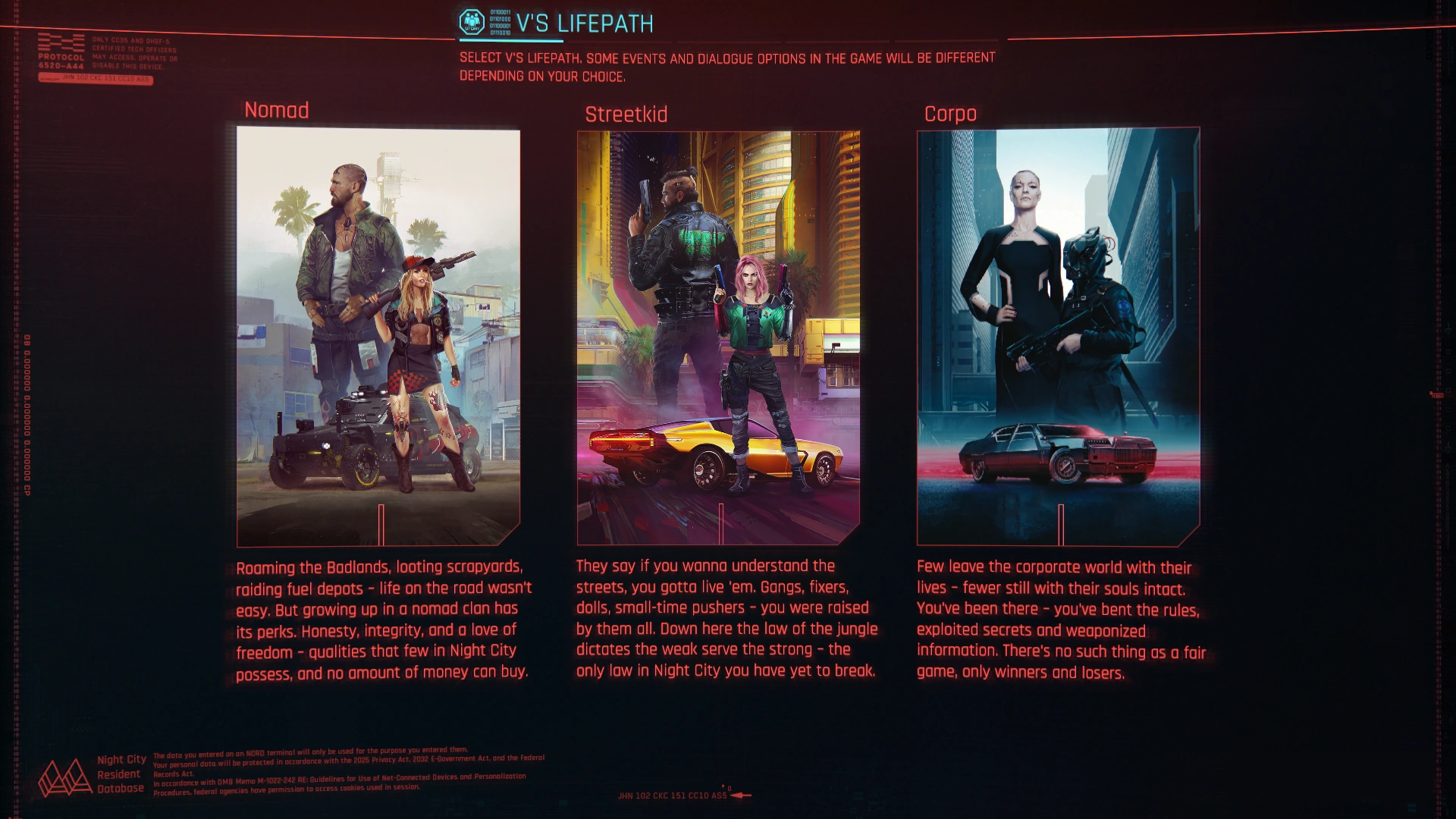 After selecting a difficulty, you have to make is selecting a Lifepath. A Lifepath provides V with an origin story and determines the first chapter, also known as the Prologue. Two of the Lifepaths, Nomad and Corpo, are based on the roles of the same name in Cyberpunk 2020, the tabletop roleplaying game on which the game is based, while the third role, the Streetkid, was specifically created for Cyberpunk 2077. The chosen lifepath cannot be altered once the game has started, and the chosen lifepath gives optional dialogue options not available to other the lifepaths.