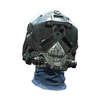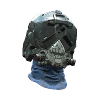 A black and blue helmet with balaclava and goggles. Features a skull graphic.