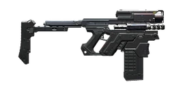 The G-58 has a retractable stock that can be adjusted in length, and many of the other parts of the weapon can be folded into the main body to make it more compact and allowing for concealed carry. The weapon has been outfitted with an advanced magnetic reloading system that snaps magazines into place with minimal effort[1], and a custom holographic sight to be used with its smart targeting system.