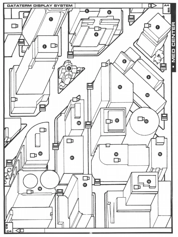 Notable corporations with businesses in or around the Medical Center included the Trauma Team and REO Meatwagon hospital centers; ALL-RX Drugs, known for the prescriptions they delivered to the many outpatients here; or Medicross Preservation and Medical Technologies, both of whom were major donors of body parts. Due to the major concentration of health-oriented businesses in this district, it was one most crowded in Night City, and around 2020 the volume of visitors was so high that the city was planning to construct a vast skyway that would interlink this neighborhood with the rest of the city to allow a greater volume of traffic. The Silver Slash gang territory occupied most of Medical Center, however, they were protectors of its streets, thus their presence was very popular among the residents. Unfortunately, the recent construction of the nearby Transit Center worried the locals, as it attracted many violent gangs to the neighborhood. These worries caused the local security to be redoubled. The northern streets were mostly safe, however, as the Municipal Criminal Justice Complex had an imposing presence in the area.[1]