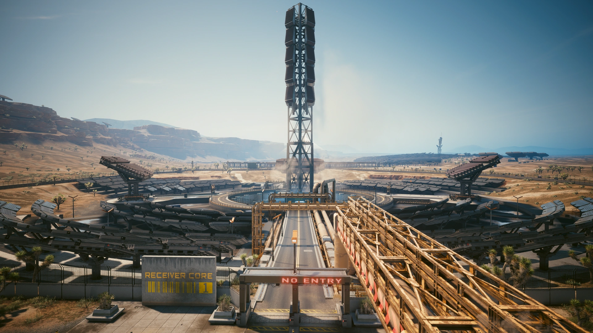 The power station consists of one large tower that functions as the power collection unit, while the three large antennas to the south collect microwave energy from satellites in orbit around Earth. The energy is then converted into enough electricity to power a large amount of the sub-districts of Night City. Additional infrastructure connected to the plant strung out alongside a road running southwest towards the South California border, and some more on the hills to the east, near the Laguna Bend Reservoir.[2]