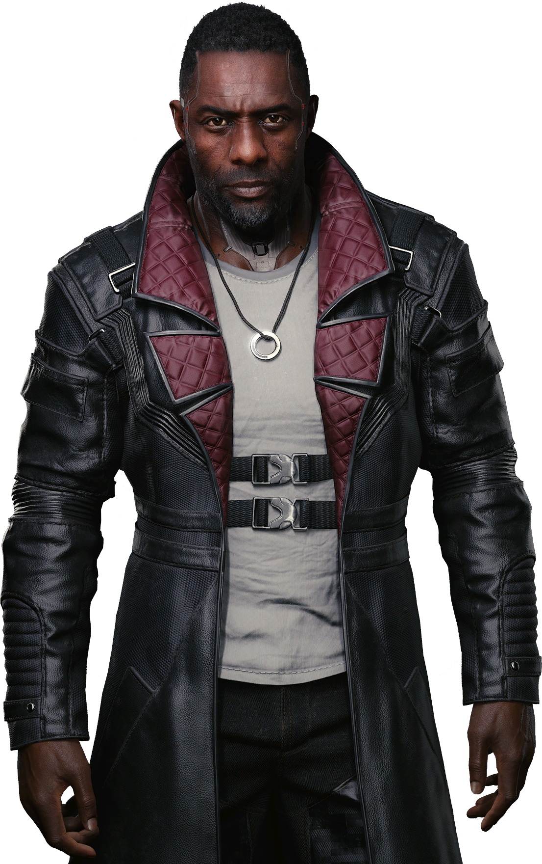 Reed is a tall, dark and masculine individual of African descent with short hair, goatee with a connected mustache (a circle beard), and visible cyberware in his temples and neck. He tends to wear a long, dark leather jacket with a red lining inside and a shirt underneath. He wears a long necklace with a circular pendant.